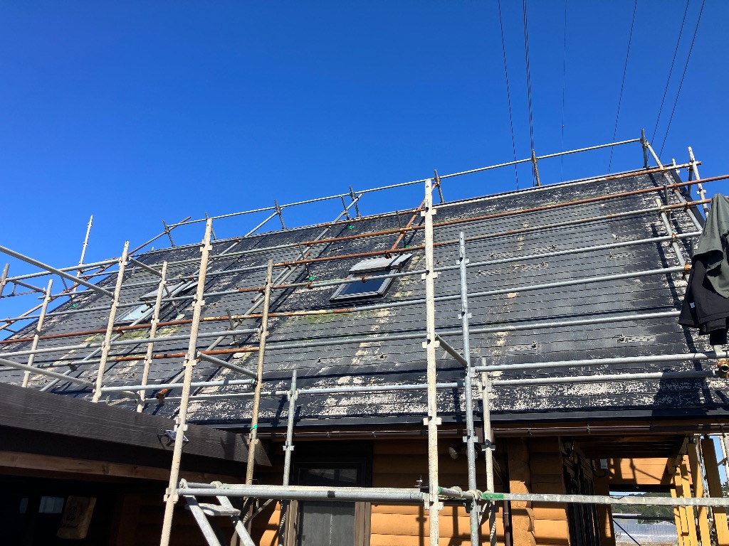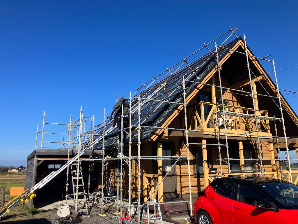 ログハウスなので多分勾配は10寸でしたのでフルハーネスをしての作業になりました。