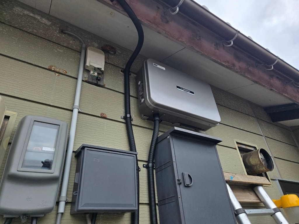 昼過ぎから小雨が降るということで、大急ぎでパネルを終わらせて、ゆっくりとパワコンを設置してきました!