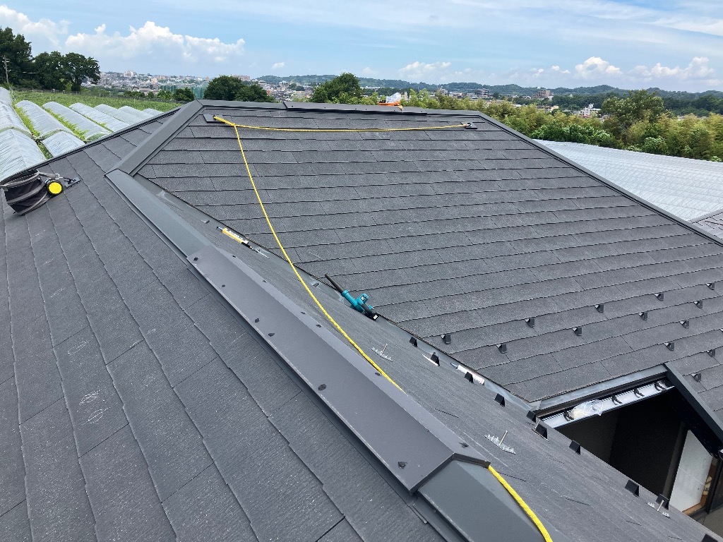 8寸勾配のスレート屋根に設置でしたので屋根足場を設置していただき施工しました。