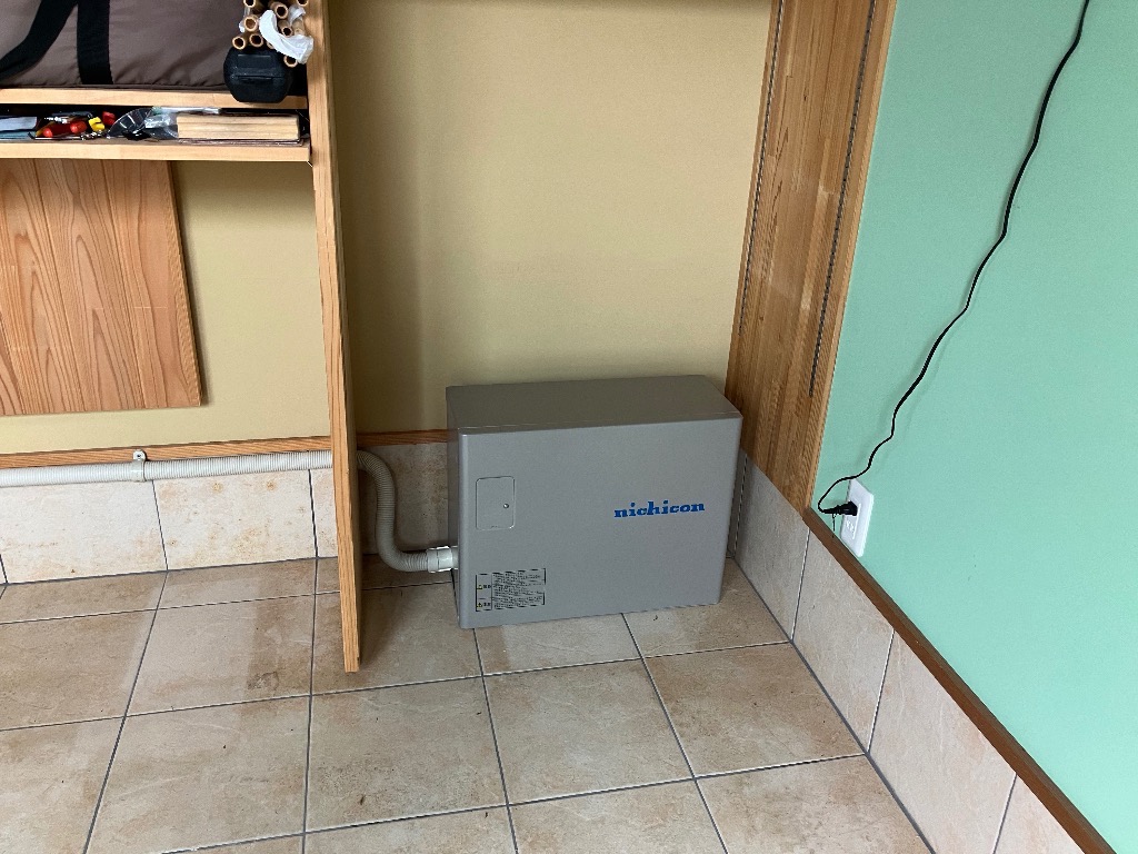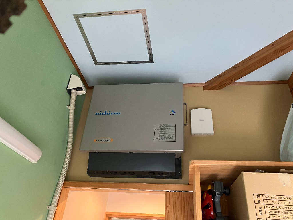 接続箱が2階のウォークインクローゼットの中で新設パワコンまで直流線を持っていかないと行けないので、2人では今日終わらないなということで、急遽近所に住んでいる電気の職人にきていただき、なんとか終わらすことができました。