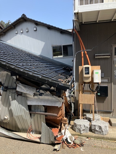 現場はというと、輪島のお客様の会社の事務所が潰れていて、建物内に付いていたパワコン等の電気機器は取り出すことは出来ませんでしたが、屋根に付いているパネルは生きているので今後もショート等しないように端末の処理をしてきました。
