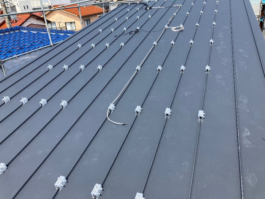 新築の屋根で下屋やパラペットが邪魔で大屋根までスライダーが掛からず途中からは手揚げでの作業になりました。